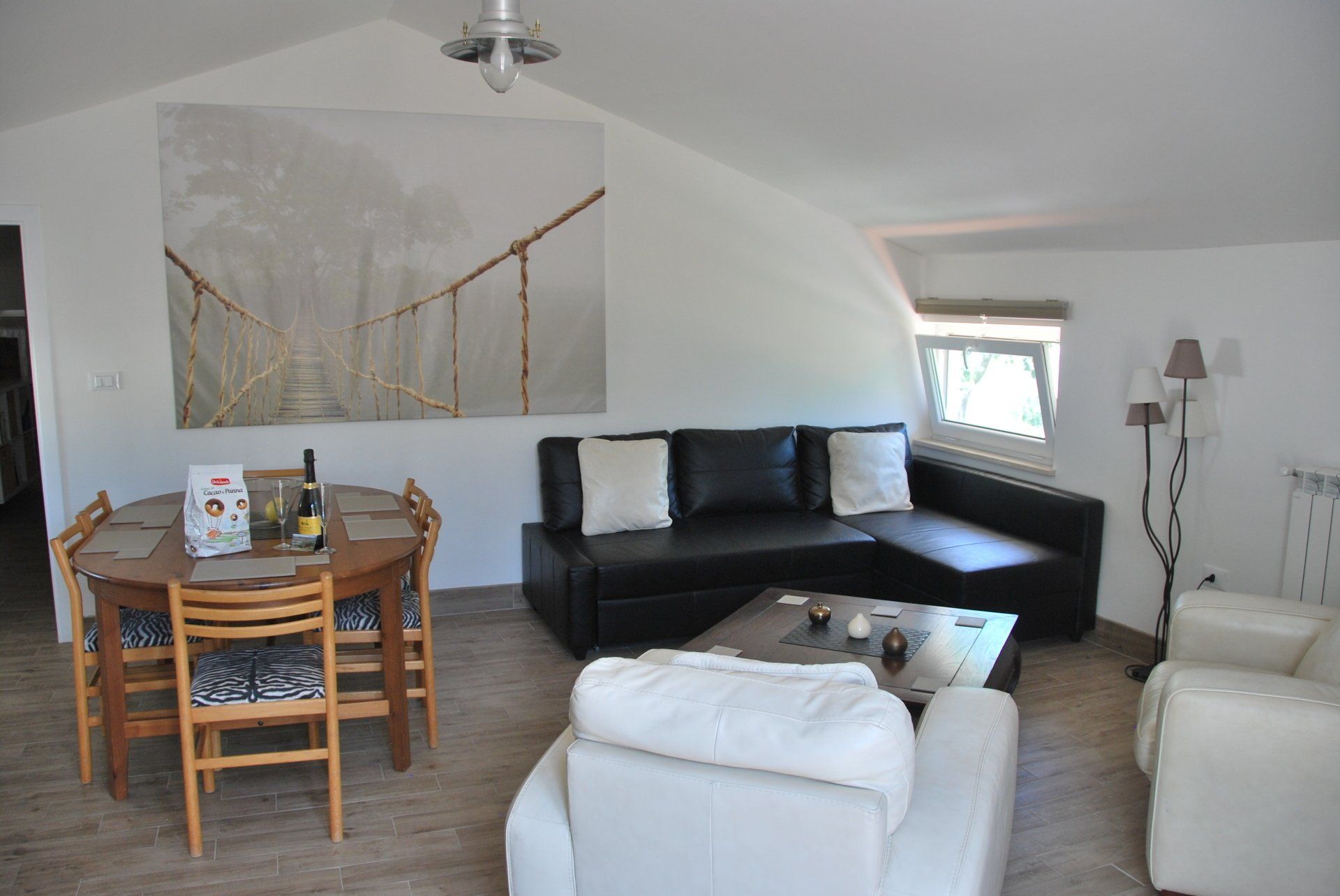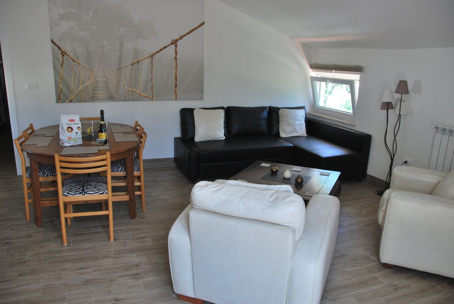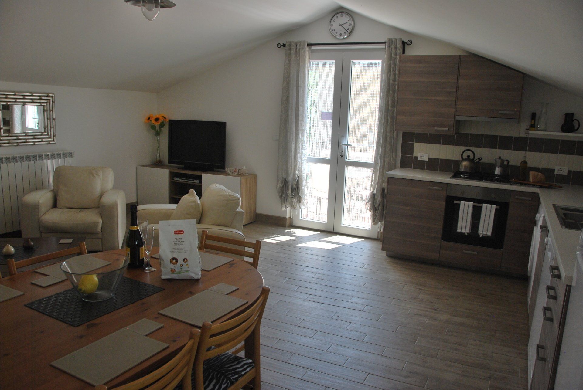 From the terrace, through french doors, you enter a spacious living room with fully fitted kitchen, dining and seating area (which is inclusive of a double sofa bed).