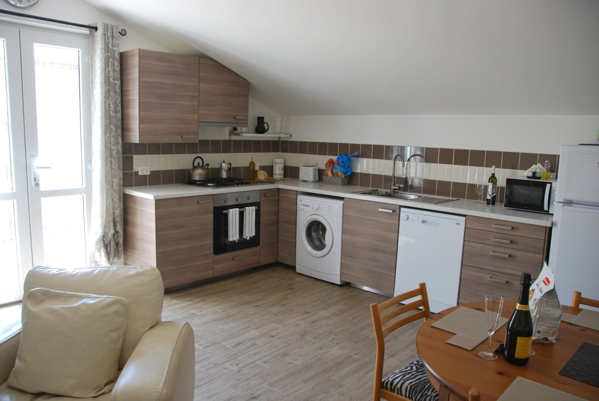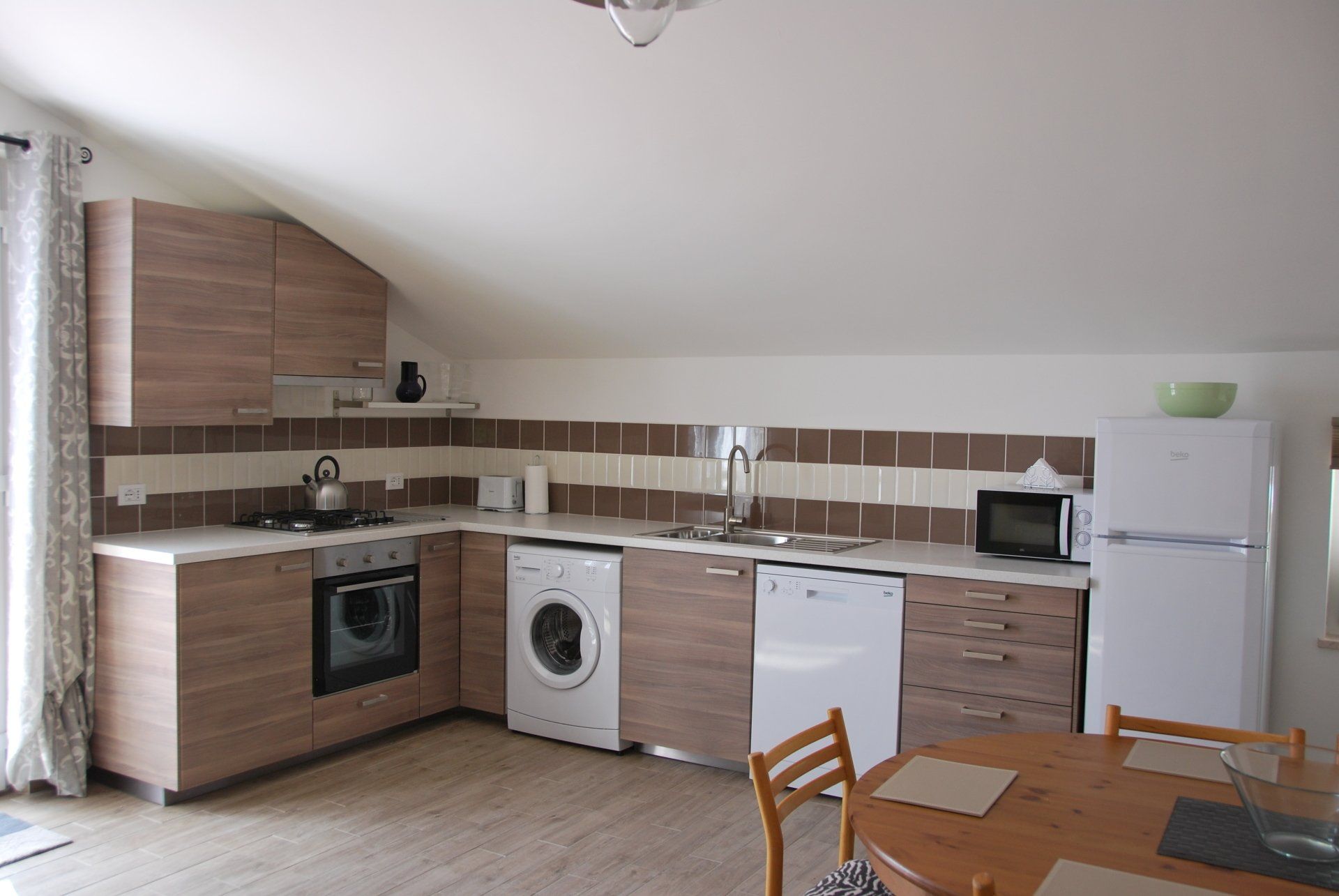 The kitchen is equipped with a full electric oven with gas hob, fridge freezer, dishwasher, washing machine, plus all china, glassware, and kitchen utensils you may need.